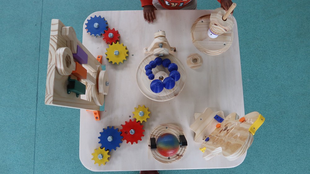 Prêt d'une table d'activité sensorielle DIY à différentes structures de Saint-Erblon pour la semaine de la petite enfance 2023 : le relai Petite Enfance Intercommunal (RPEI), l'école publique Louise Michel, l'école privée Saint-Jean, l'accueil de loisir et la crêche Chapi Chapo.