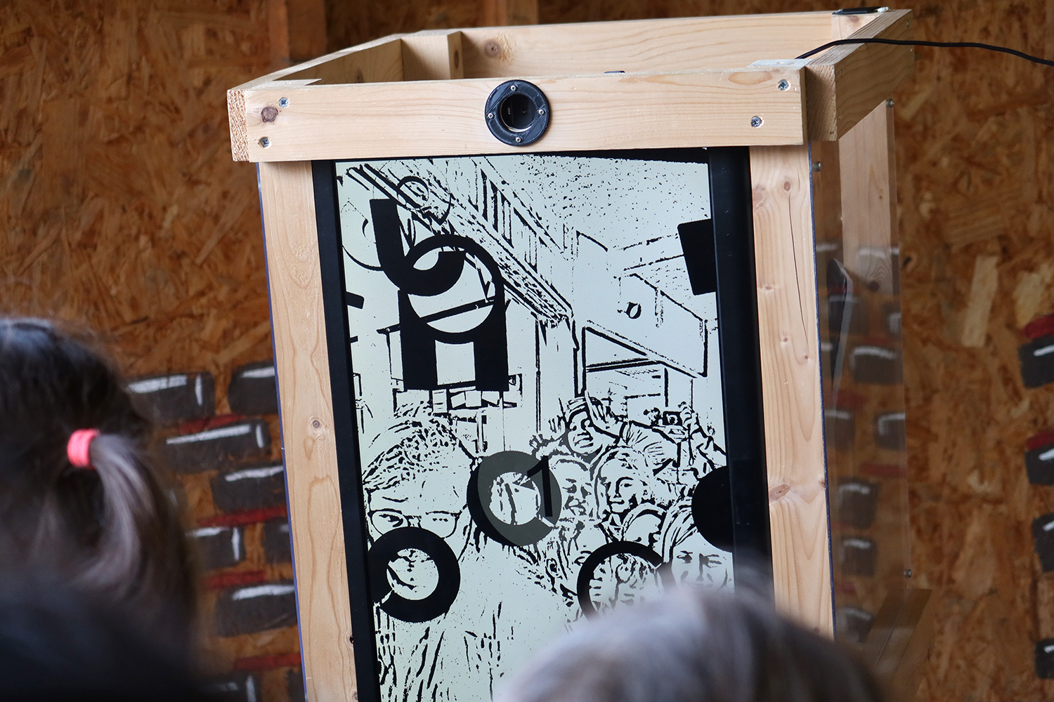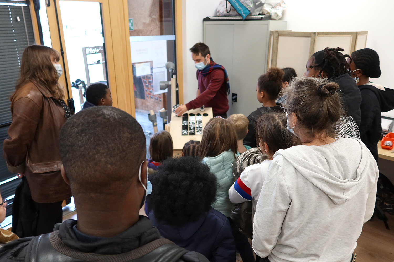 Visite et médiation auprès d'un groupe d'enfants de l'accueil de loisirs Dominique Savio. Les artistes ont présenté l'artlab et accompagné le groupe pour une médiation de l'exposition monographique Pas froid aux yeux consacrée au travail de Vera Molnar.