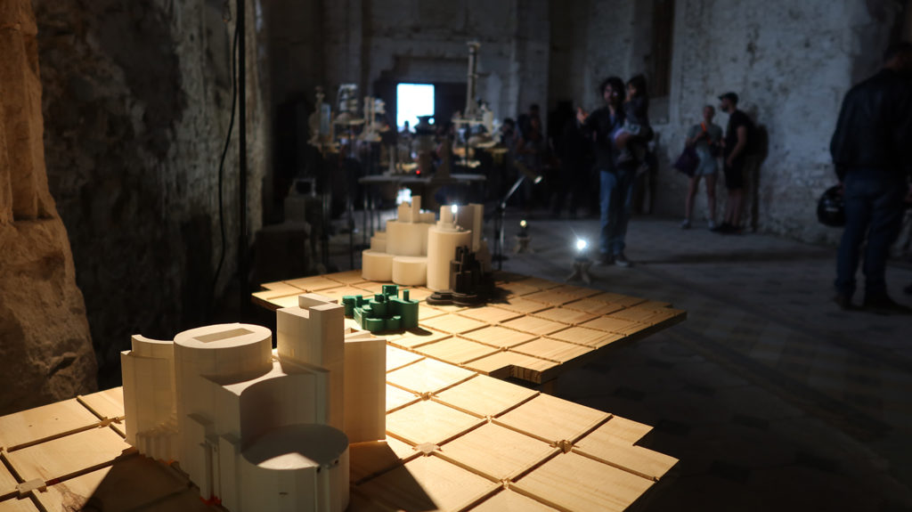 En déplaçant six formes abstraites sur six tablettes interactives, on joue avec les espaces disponibles et, selon les configurations graphiques, une ambiance sonore se compose. La construction de ce paysage questionne. Bâtiments, aliments, vaisseaux ? Notre imagination trouvera diverses interprétations.