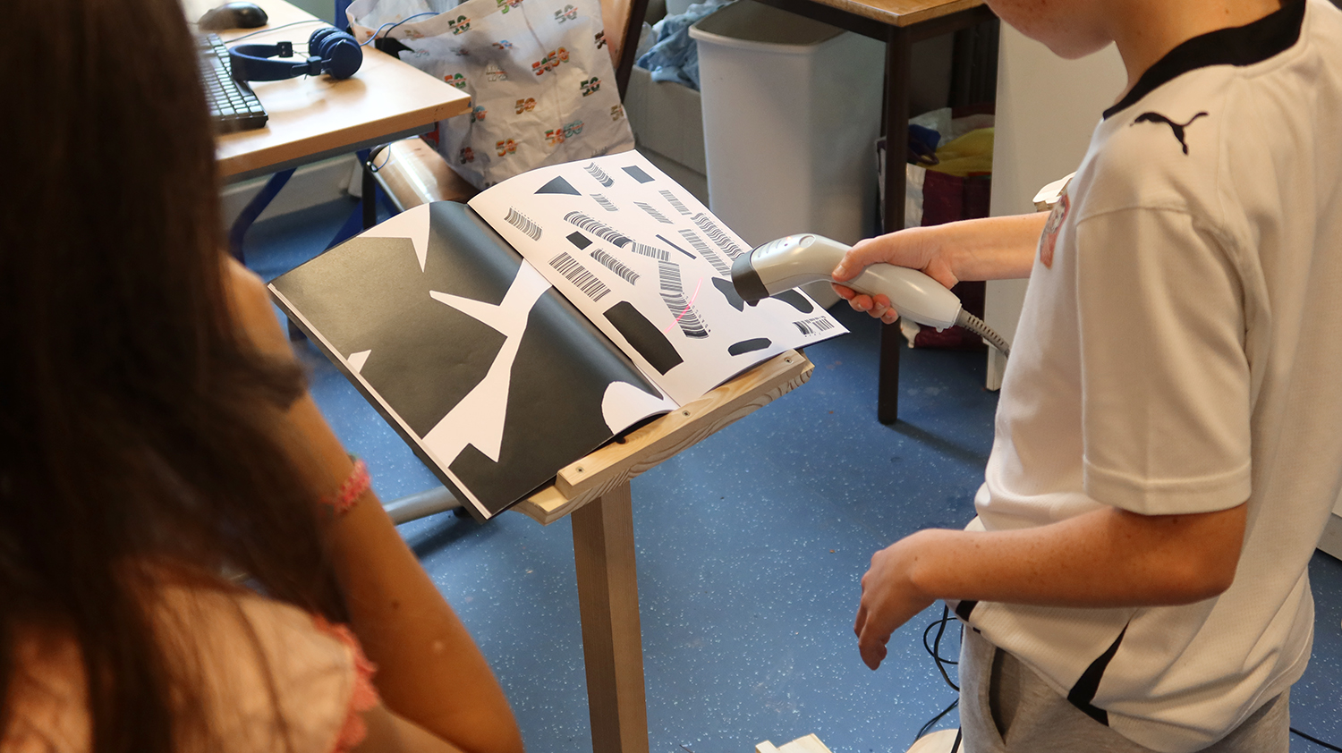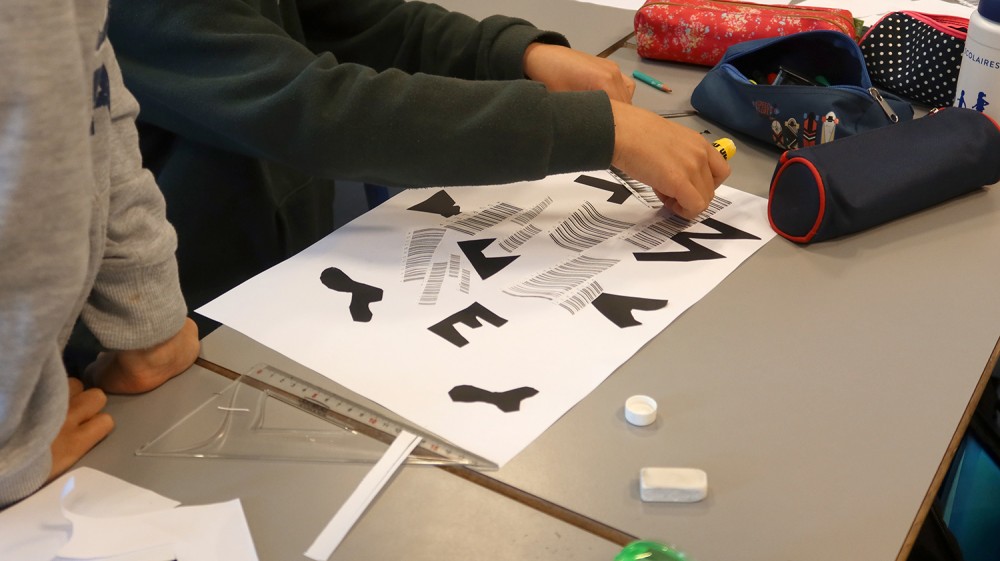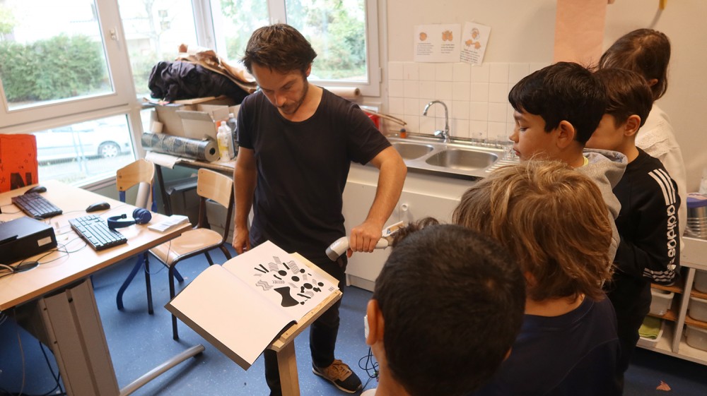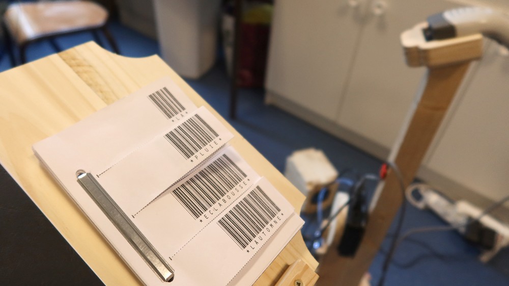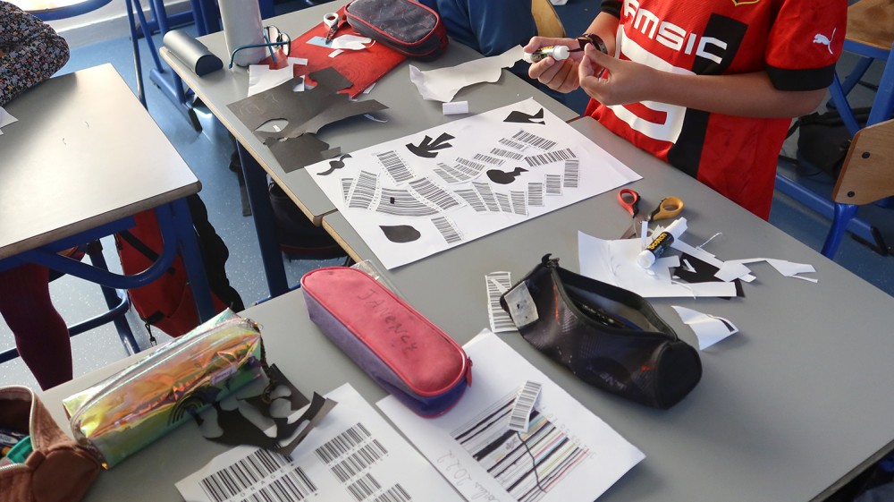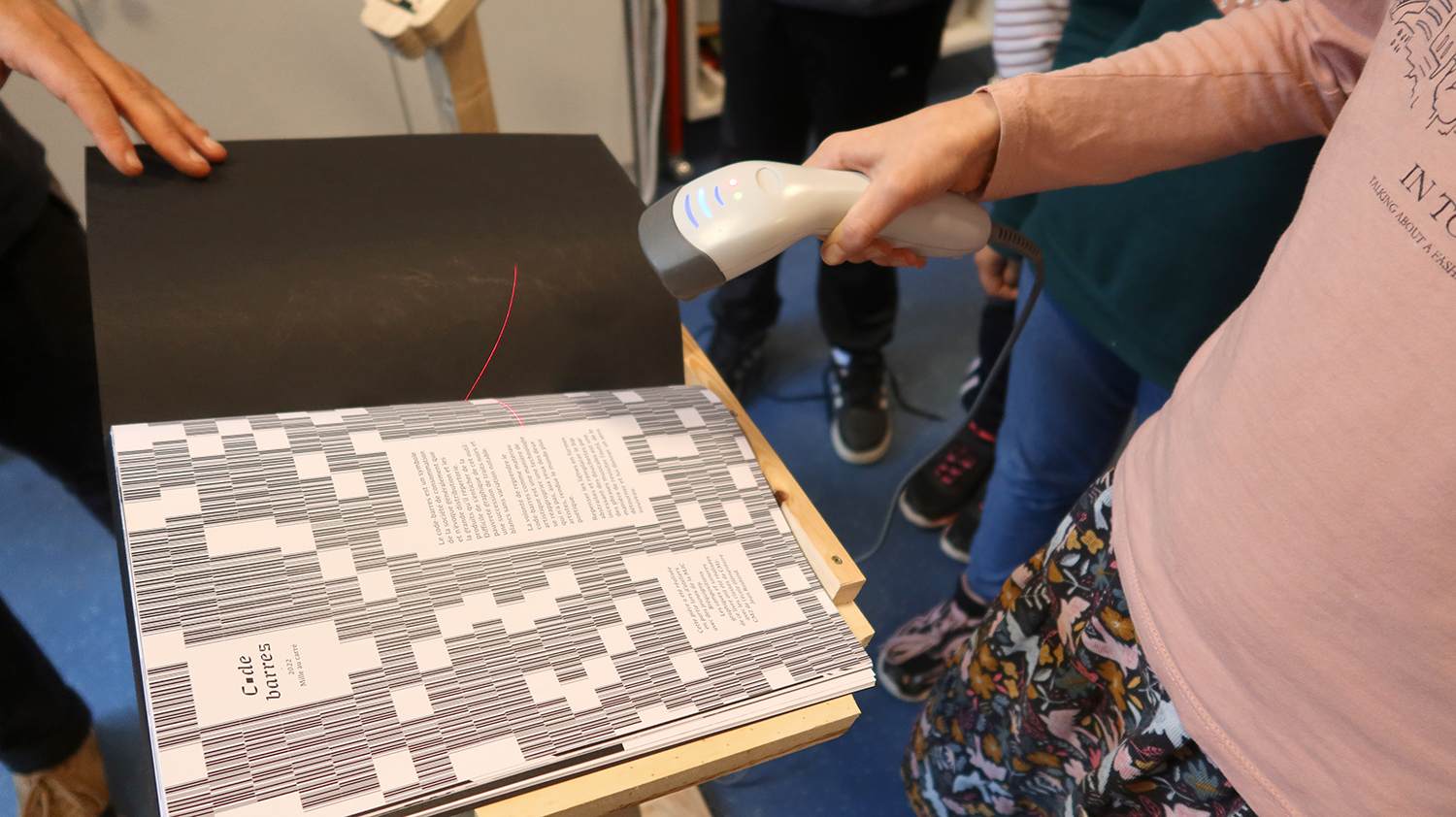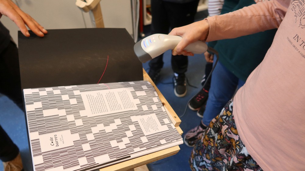 Ateliers de création autour de l'oeuvre Code barres. Les élèves des classes de CM1-CM2 de l'école Jean Rostand ont d'abord joué et enregistré des sons avec les Phonotons. Ils ont ensuite créer des petits poèmes transformés en code barres, et créés des compositions graphiques avec ces éléments.
