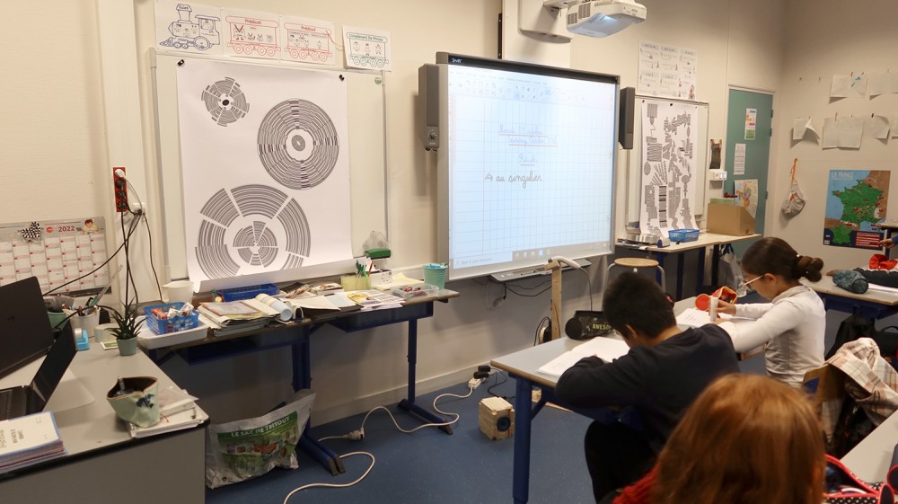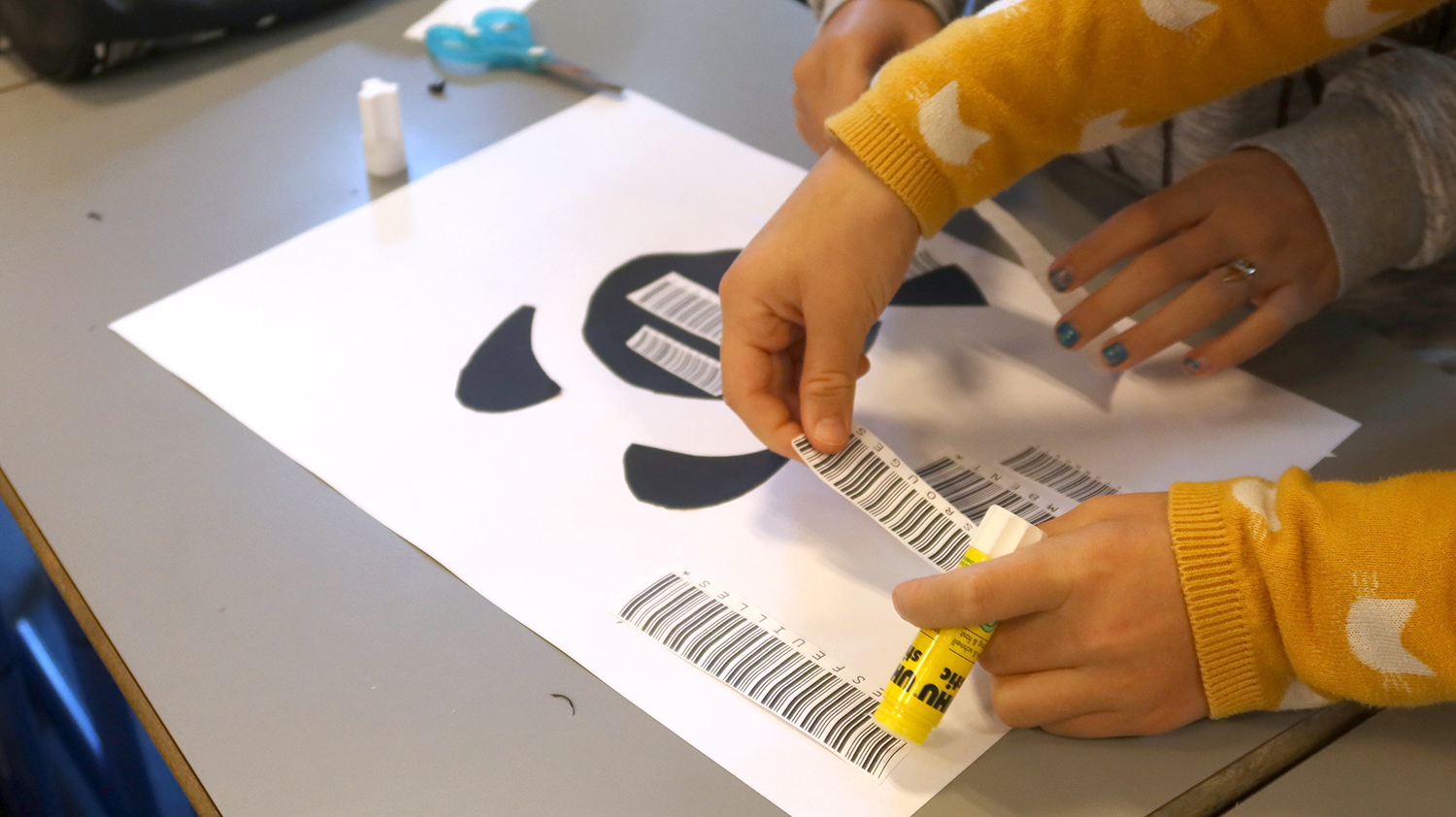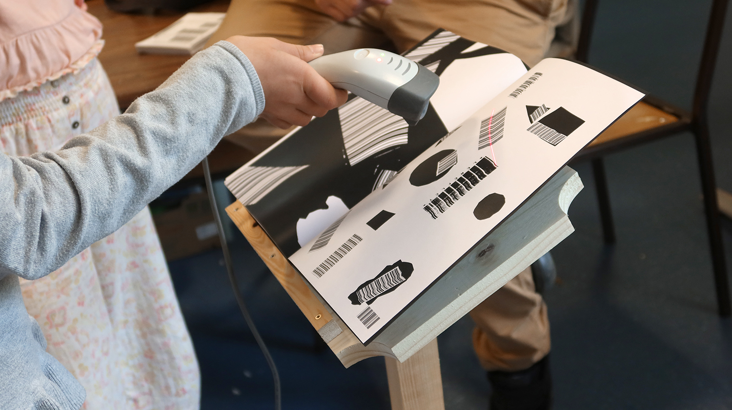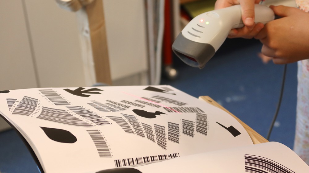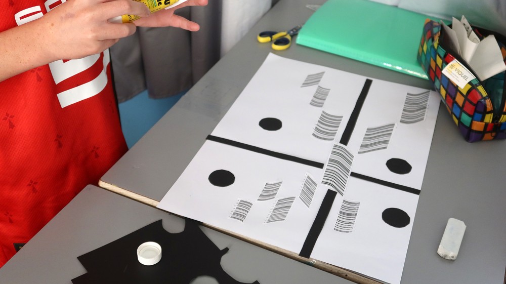 Ateliers de création autour de l'oeuvre Code barres. Les élèves des classes de CM1-CM2 de l'école Jean Rostand ont d'abord joué et enregistré des sons avec les Phonotons. Ils ont ensuite créer des petits poèmes transformés en code barres, et créés des compositions graphiques avec ces éléments.