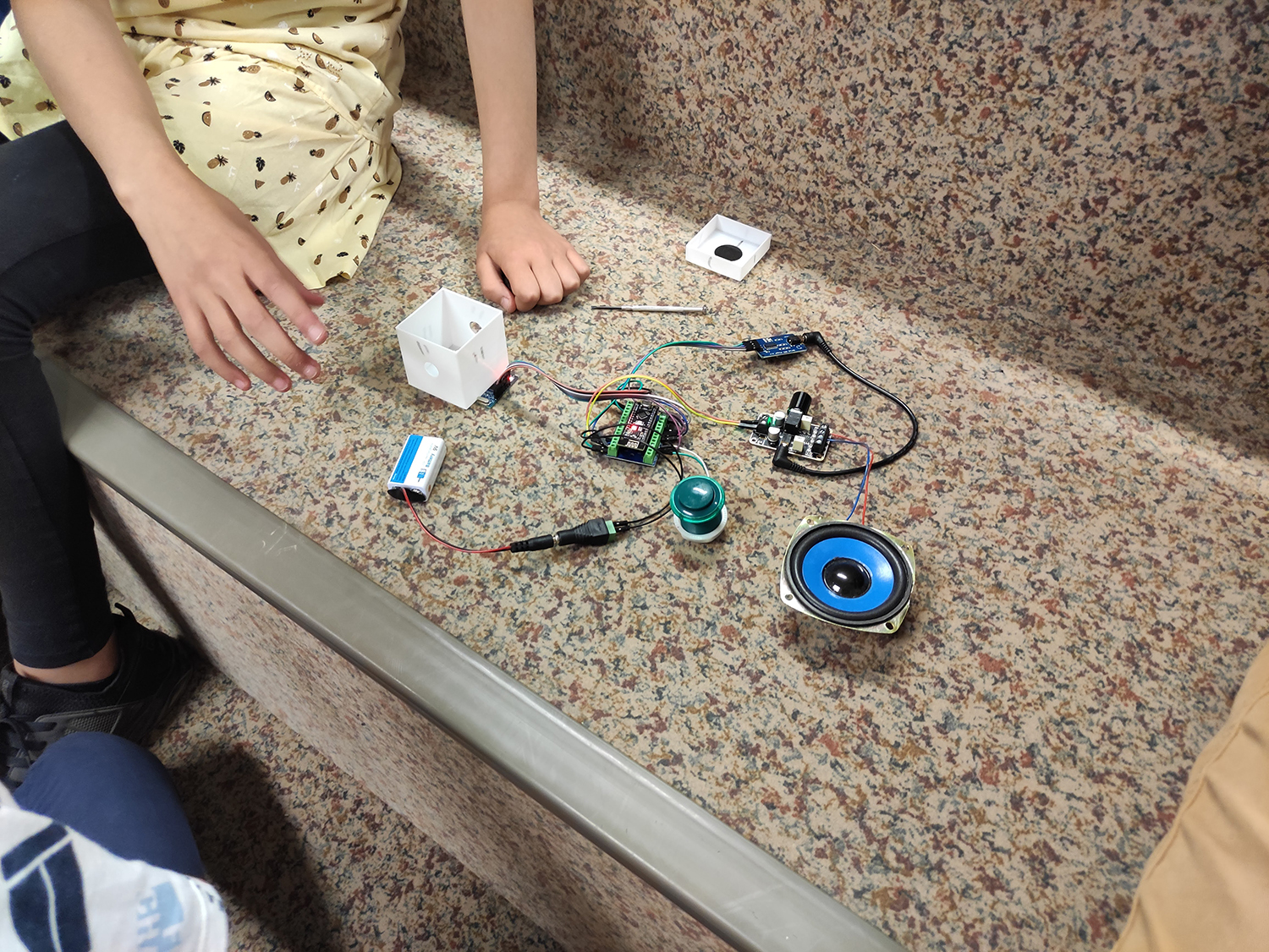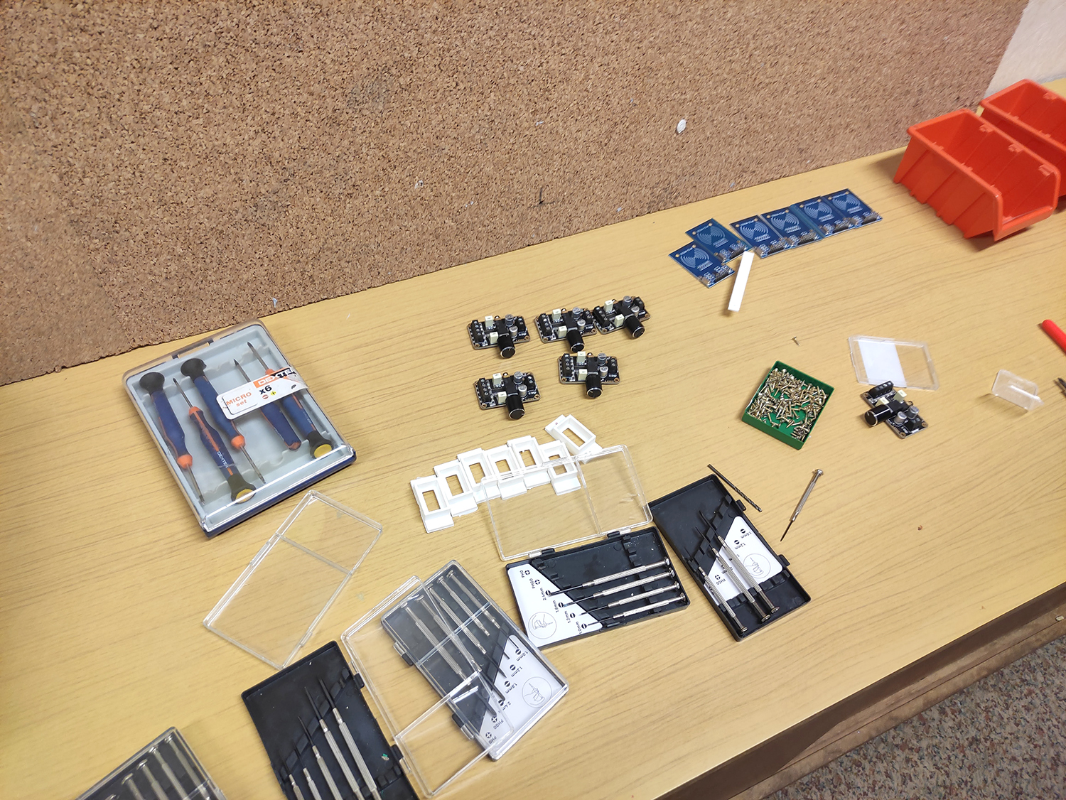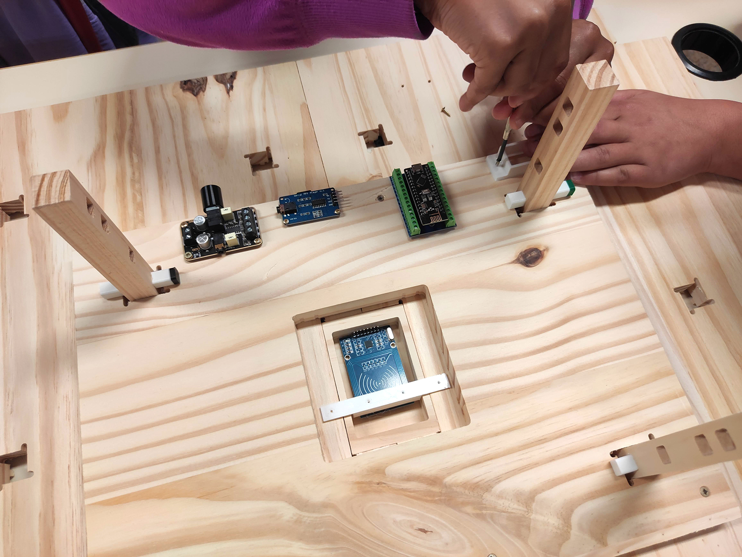 - assemblage des composants électroniques sur les socles : lecteur RFID, carte aduino nano RF, lecteur MP3, ampli et pile