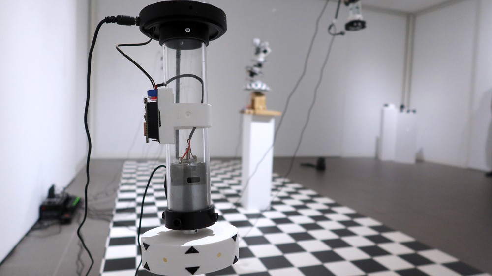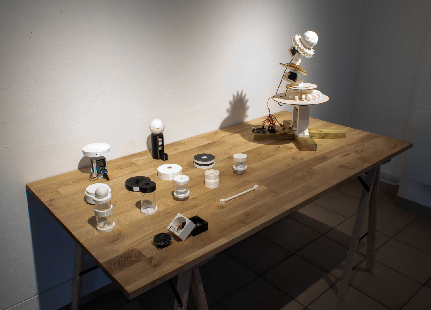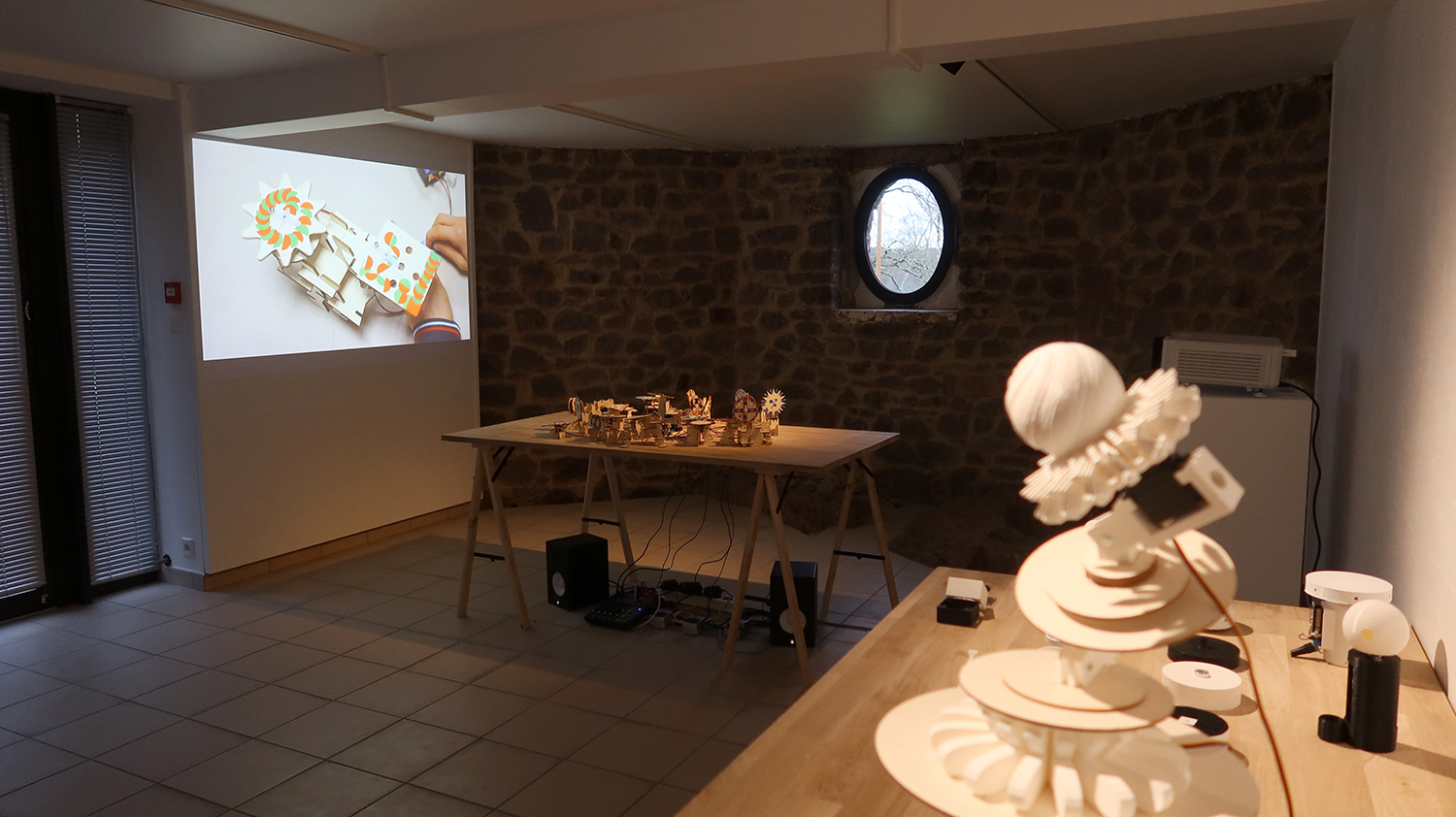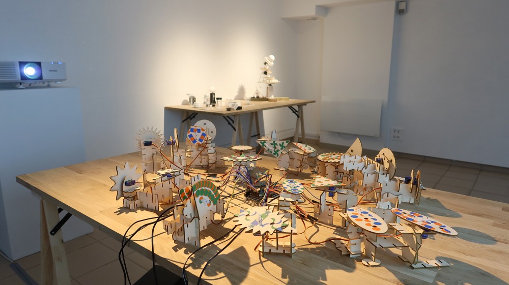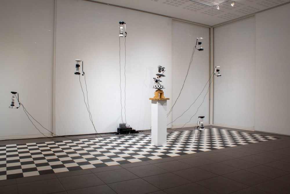 Exposition in-situ Les Flûtes et le Fou à L'Aparté à Iffendic qui fait à suite à 2 mois de résidence dans le lieu. L'exposition présente deux nouvelles créations : Les Flûtes et Le Fou actionnées par L'Horloge ainsi qu'une série d'éditions/sculptures sonores intitulée Les Phonotons, série 5.