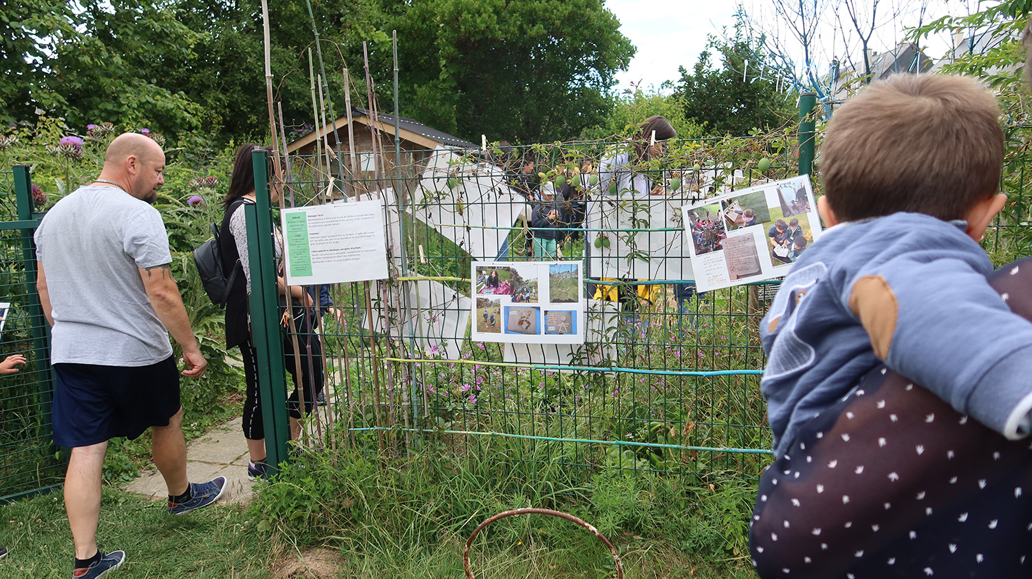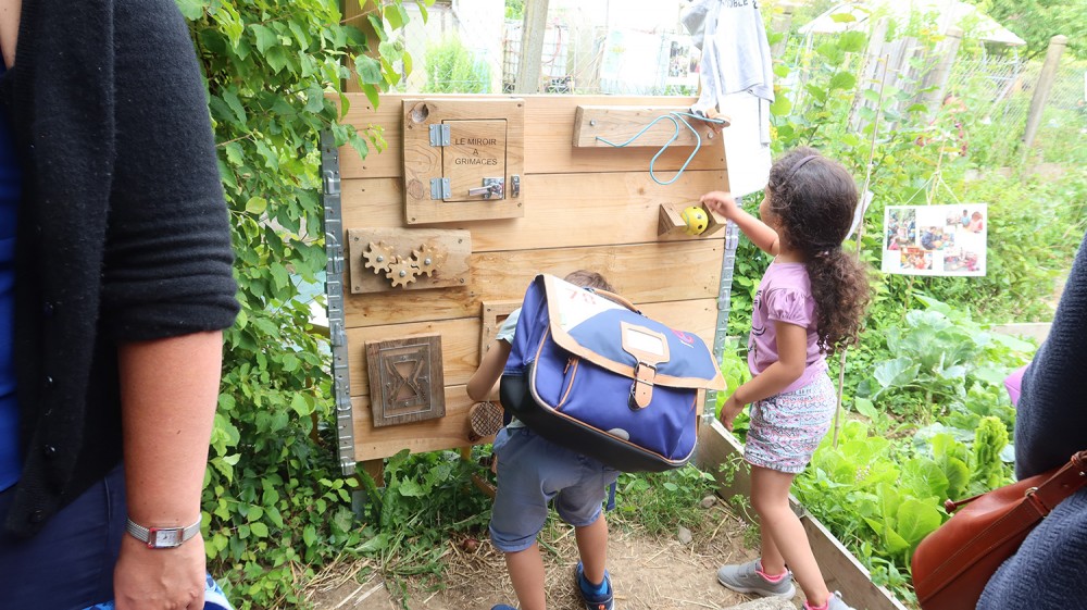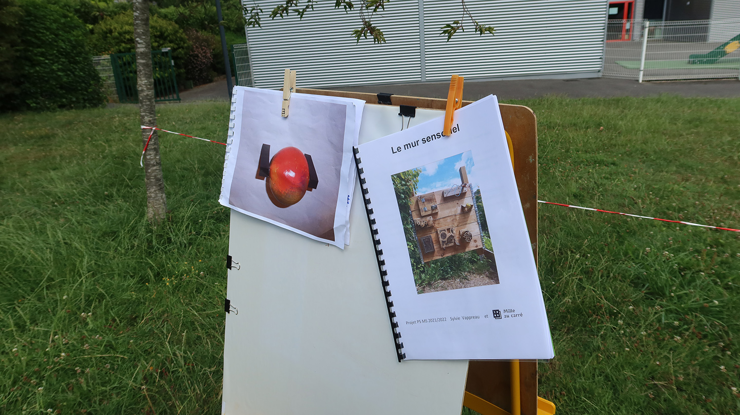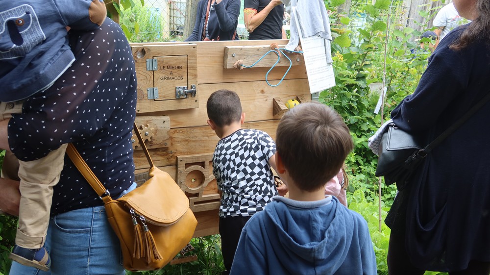 Restitution en présence des parents d'élèves du travail mené avec Sylvie Vappreau pour son projet La classe dehors. L'occasion de présenter le mur sensoriel dans le jardin partagé pédagogique, dont certains modules ont été créés avec Sylvie à l'artlab.
