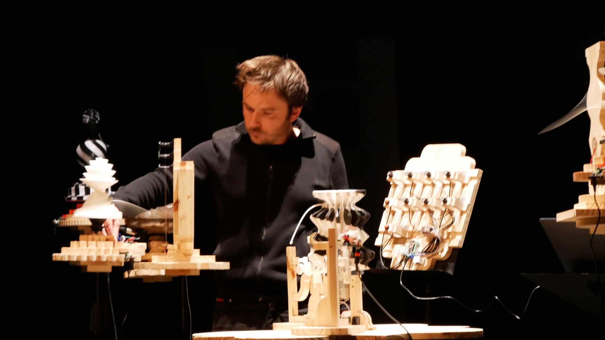 Un petit concert des Phonotons dans sa version réduite introduisait la journée, suivi d'une présentation de plusieurs oeuvres du collectif : Table d'activité, Code-barres et Bras.