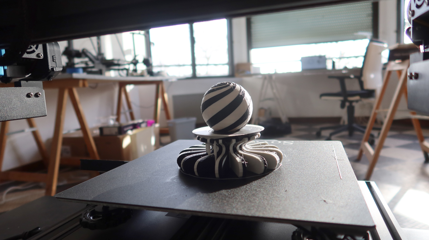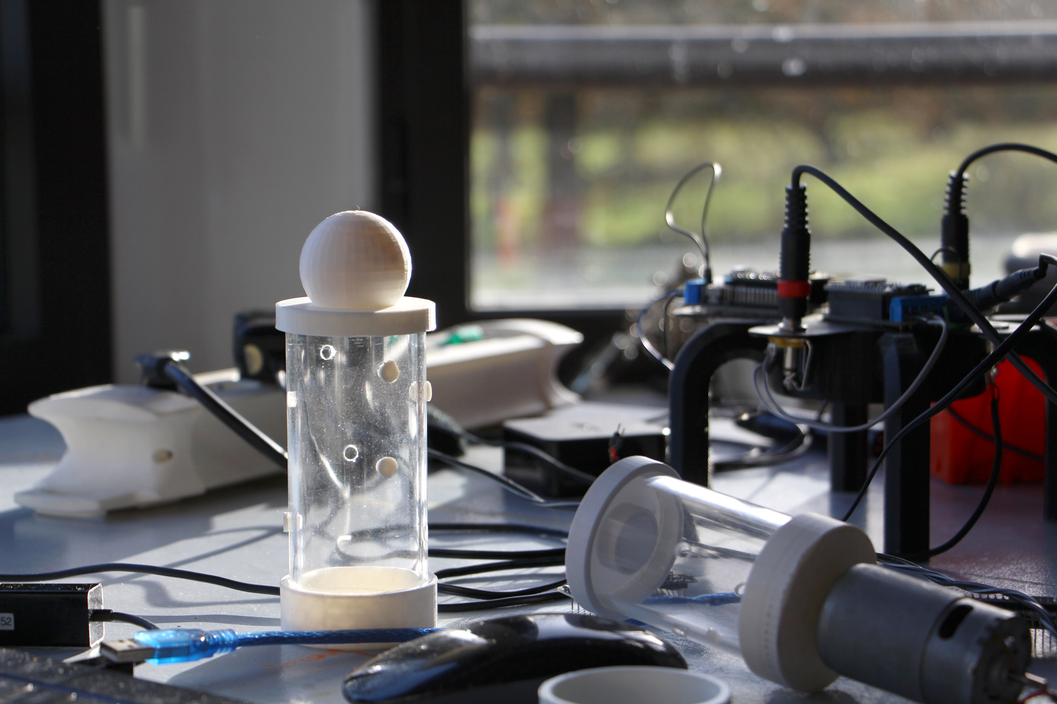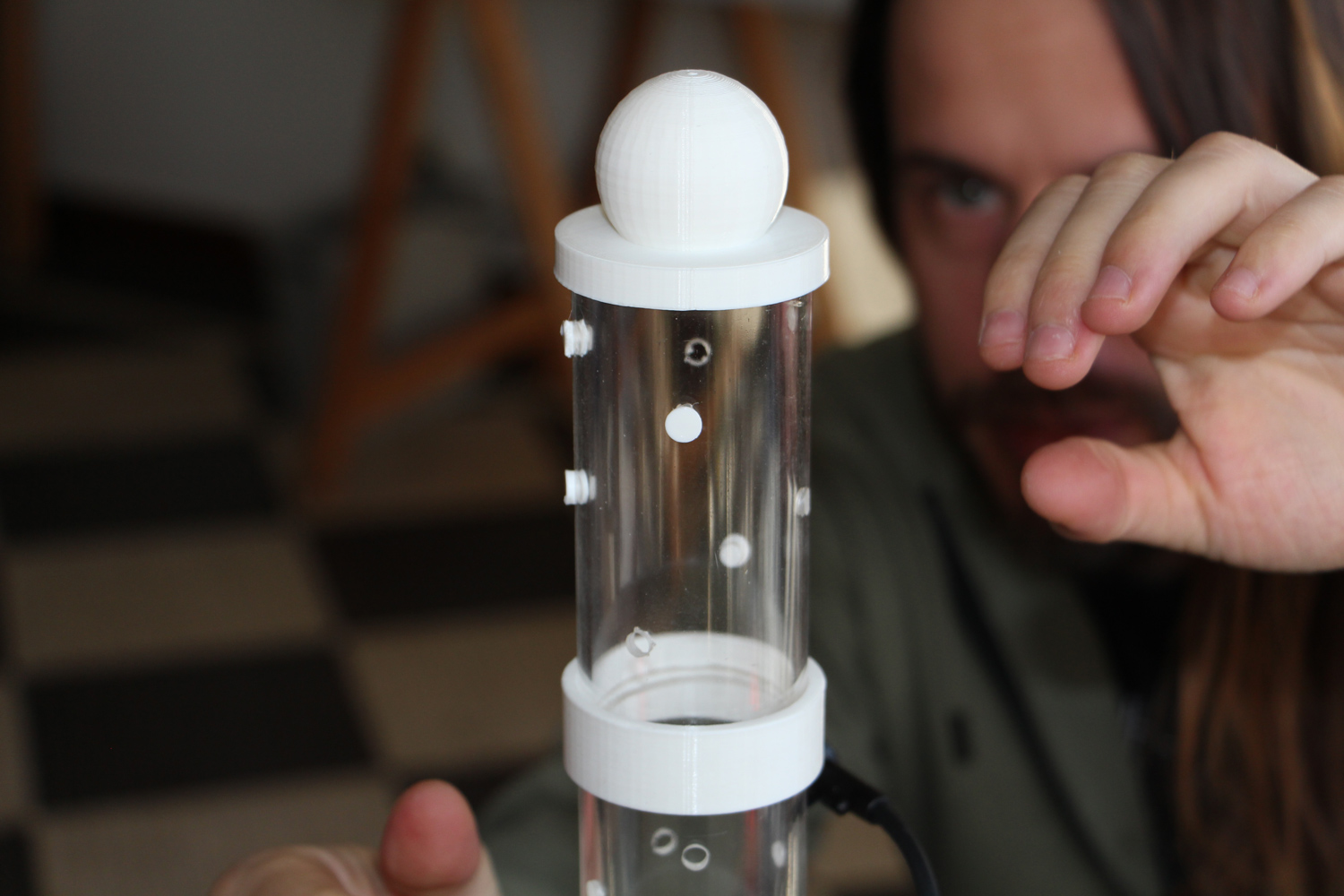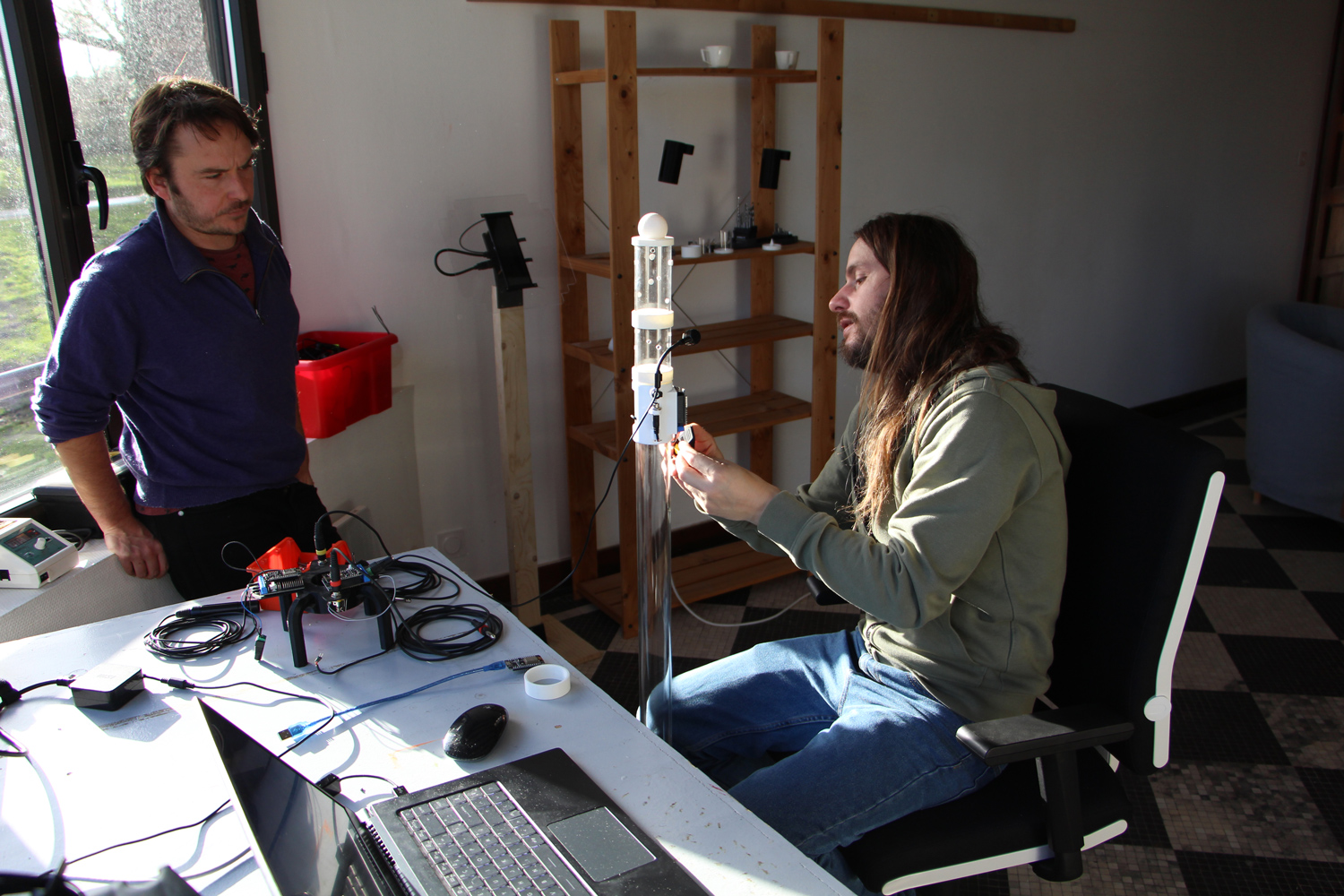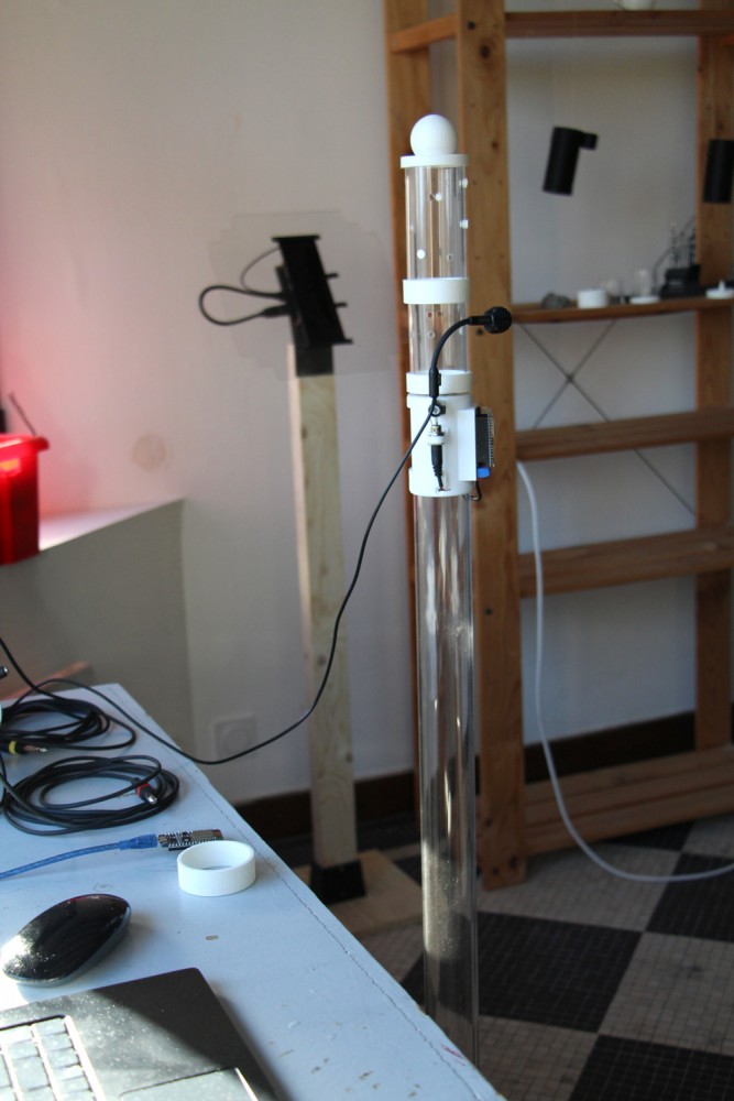 L'installation, qui se nomme Les Flûtes et le Fou, fait dialoguer les deux oeuvres-automates entre elles, et raconte une fable graphique et sonore abstraite et poètique.