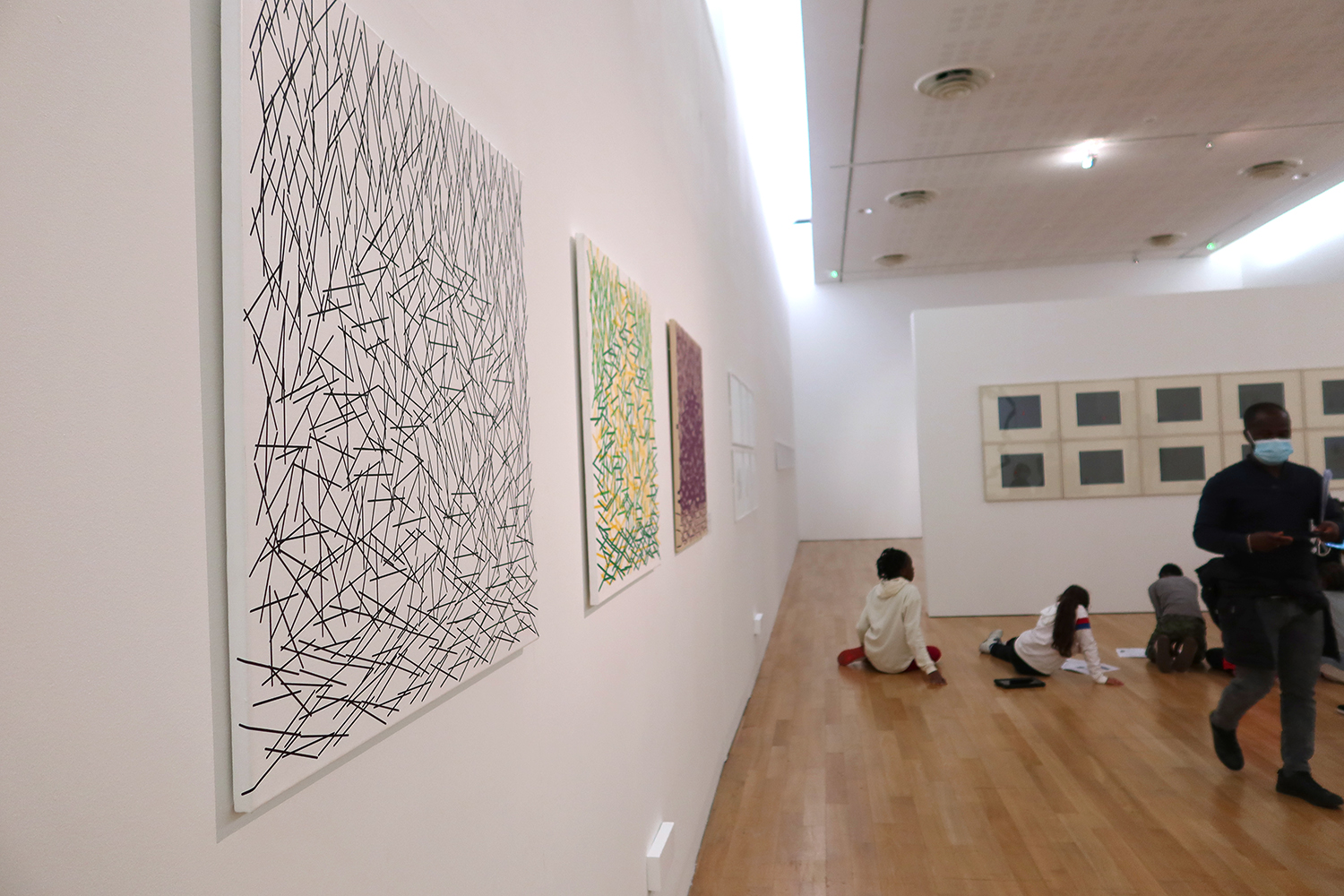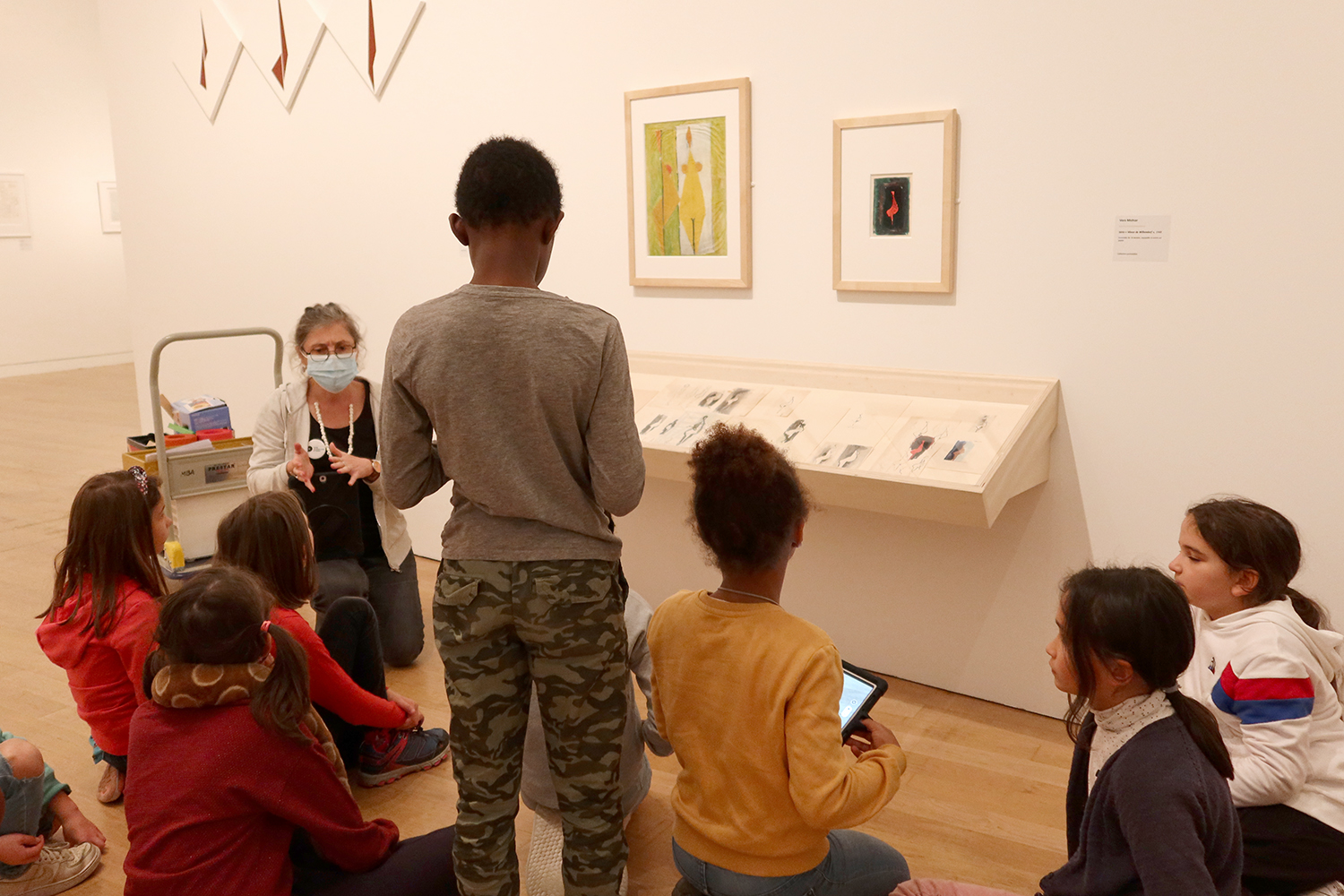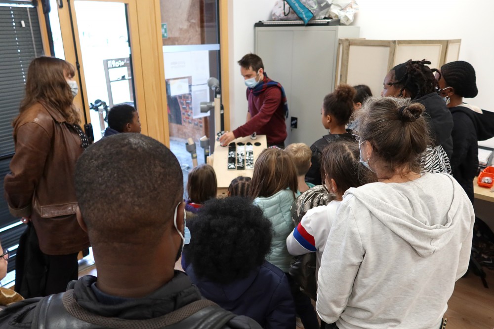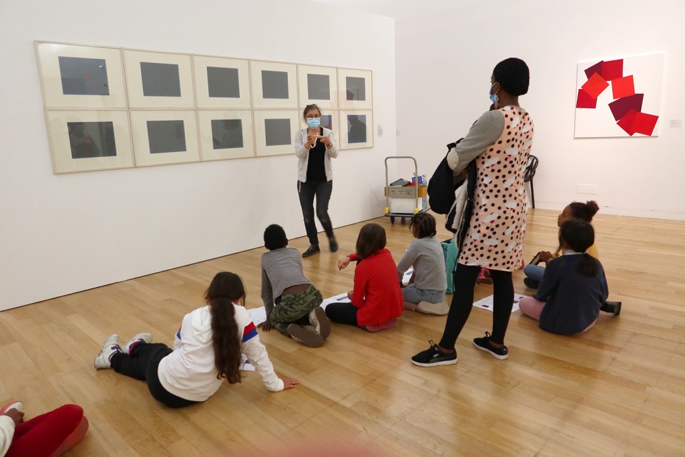 Visite et médiation auprès d'un groupe d'enfants de l'accueil de loisirs Dominique Savio. Les artistes ont présenté l'artlab et accompagné le groupe pour une médiation de l'exposition monographique Pas froid aux yeux consacrée au travail de Vera Molnar.