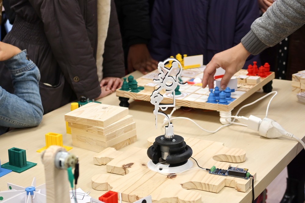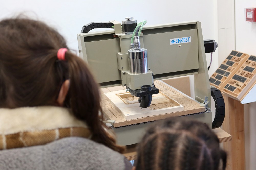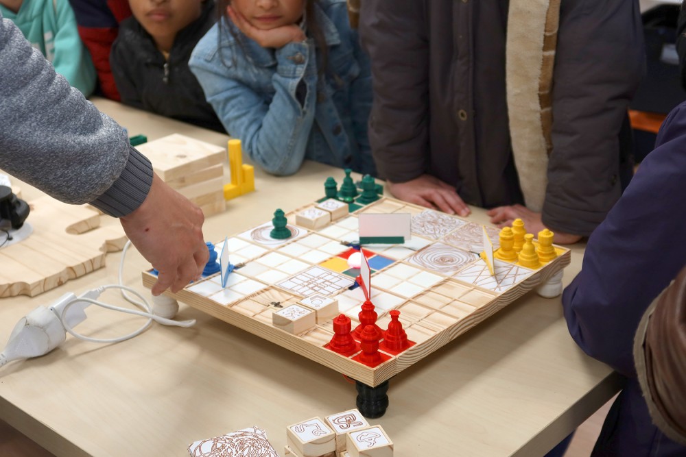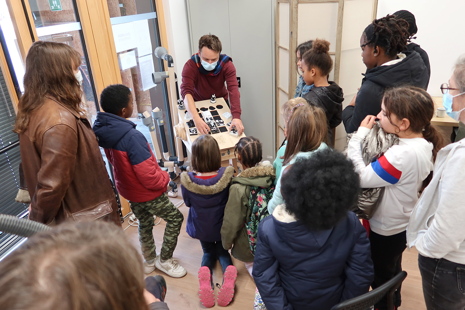 Visite et médiation auprès d'un groupe d'enfants de l'accueil de loisirs Dominique Savio. Les artistes ont présenté l'artlab et accompagné le groupe pour une médiation de l'exposition monographique Pas froid aux yeux consacrée au travail de Vera Molnar.