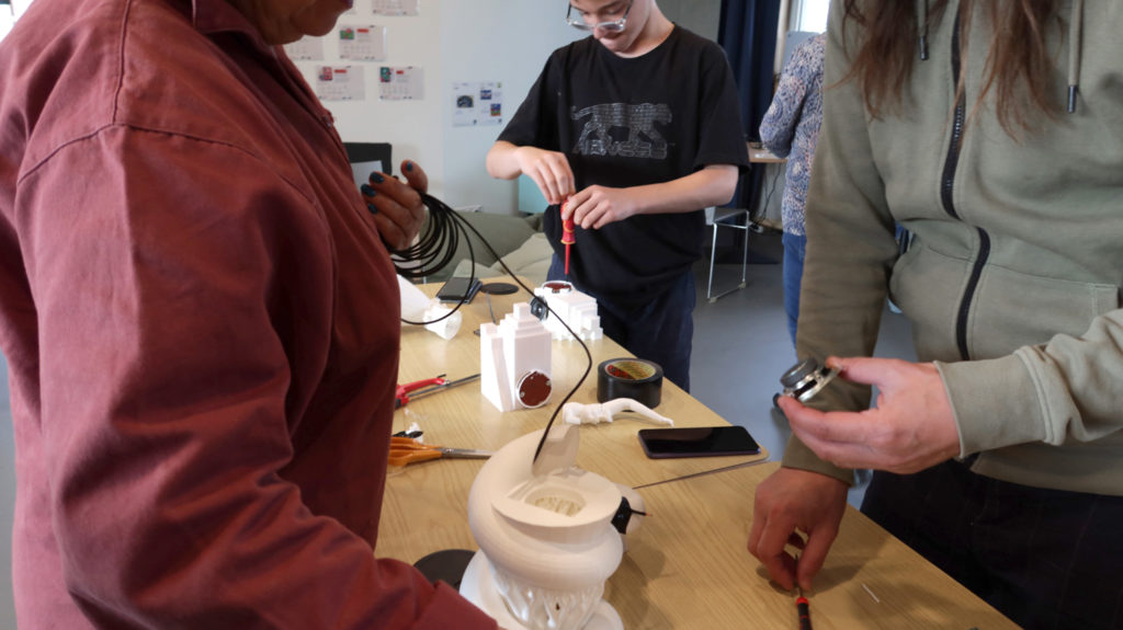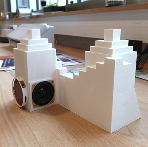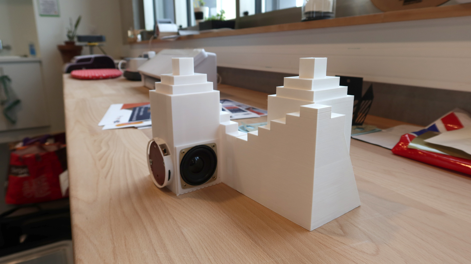 Ces enceintes ont initialement été conçues par cinq participants lors d’un atelier au Phare, à Bain-de-Bretagne. À l’origine conçues comme des enceintes Bluetooth indépendantes, l’ensemble a été repensé en une installation à part entière.
